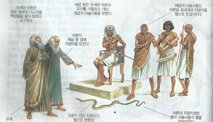 하나님의 능력을 상징하는 아론의 지팡이가 애굽의 왕권을 상징하는 마술사의 뱀을 집어 삼켰다.