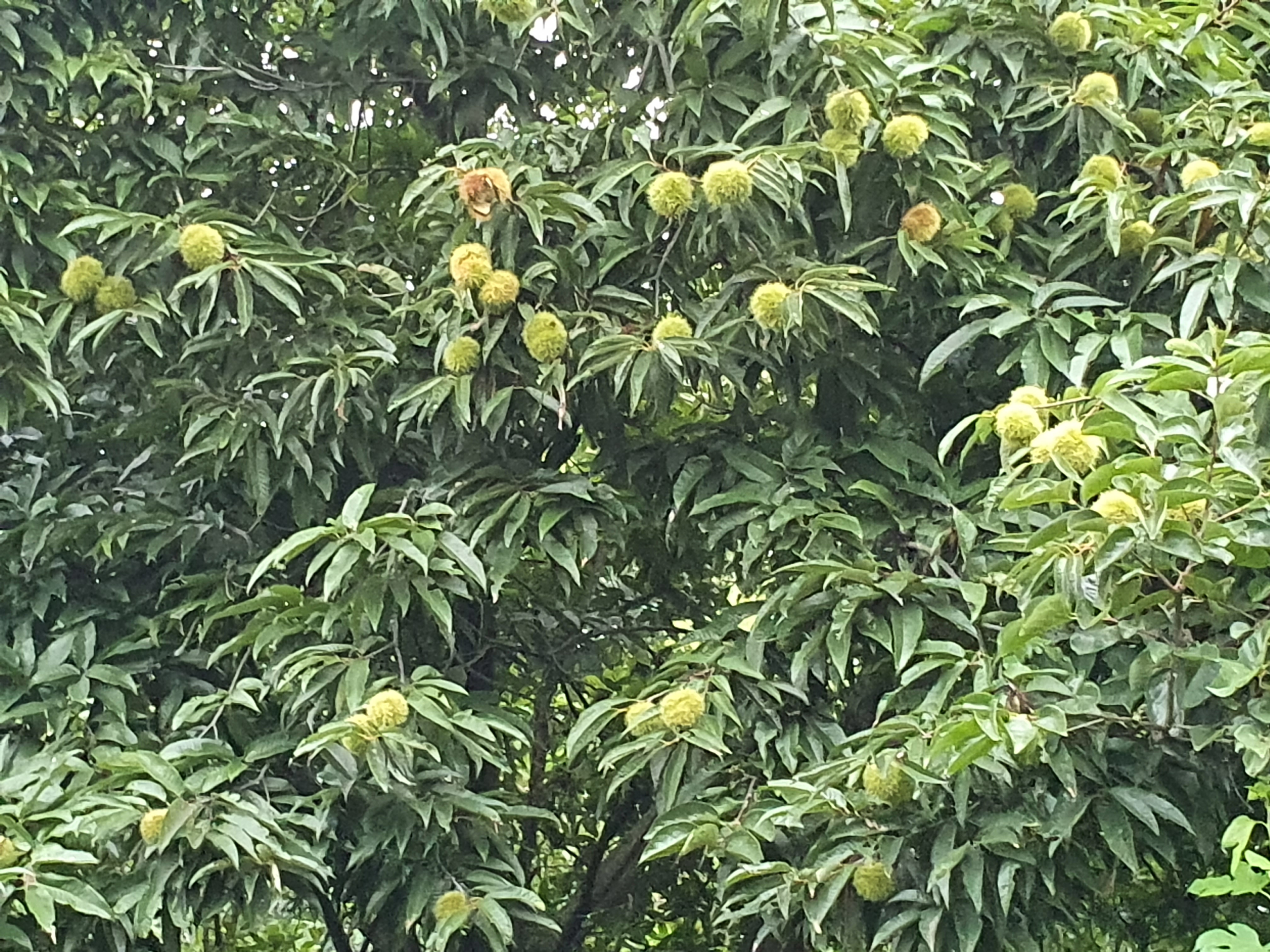 밭 끝자락에 서 있는 밤나무 익어서 알밤이 떨어지고 있다.