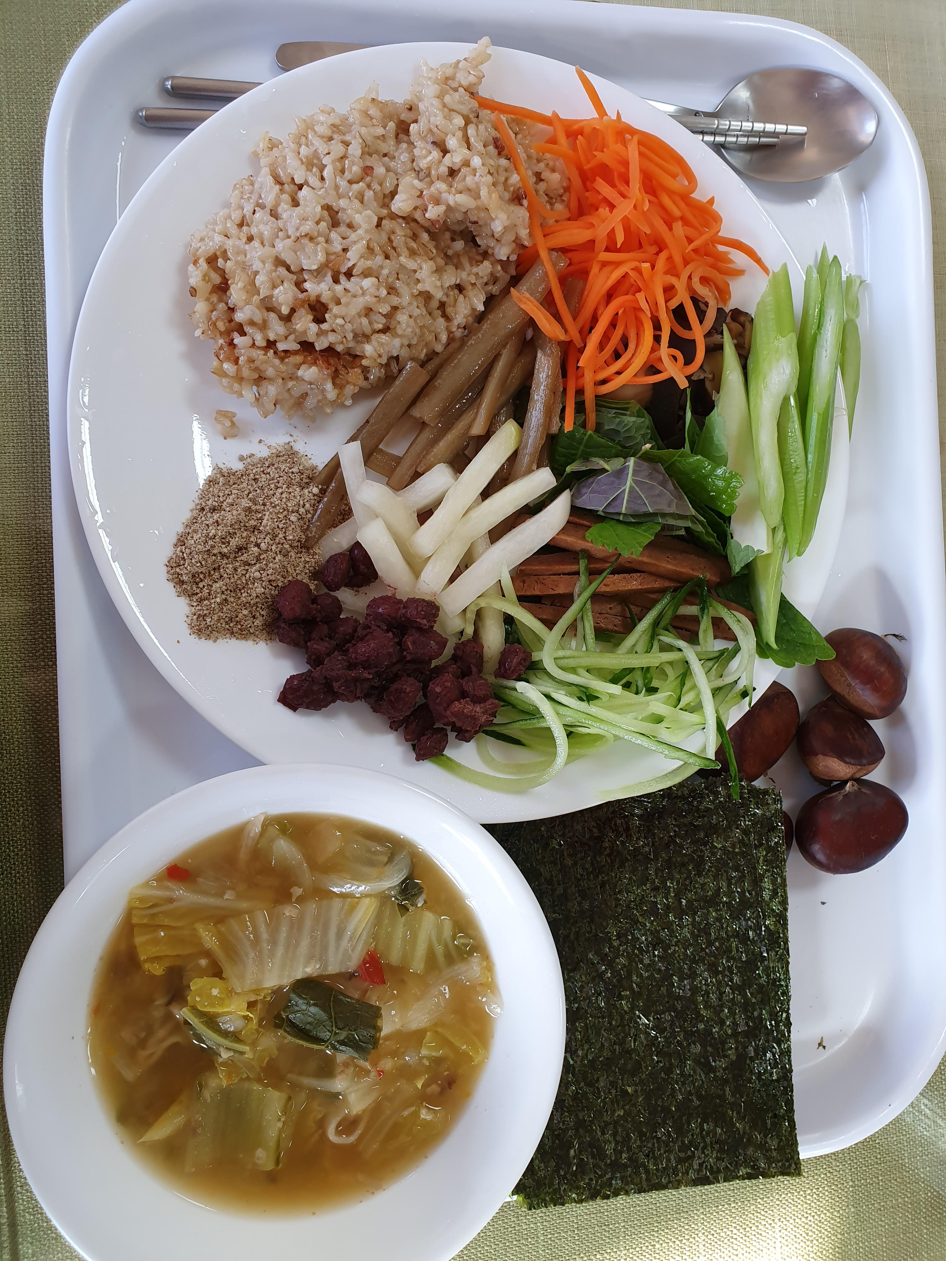 집에서 지내는 요즘 야채수부터 만든다. 무, 양파 , 다시마 , 표고버섯, 함께 넣어 끓이다가 물이 삼분의 일쯤 줄어들면, 그 야채수로 찌개든 국이든 볶음이든 음식을 조리한다. 다음은 견과류를 갈거나 그냥 섞어 먹는다. 설탕과 기름은 자제한다. 밥은 현미에 콩을 넣어 지은 밥인데 야채수로 지어서 맛나다. 찬을 만들어 보니 그곳에서 먹던 반찬보다는 뭔가 조금 부족하다. 그래도 공부를 열심히 한 덕에 옛날보다는 맛이 좋아졌음을 스스로 느낀다. 가끔 감자, 가지, 당근, 대파 , 단호박, 고구마, 이것 저것을 굽거나 쪄서 땅콩소스나 간장소스에 찍어 먹는다. 재료 본연의 맛을 느낄 수 있어서 좋다.