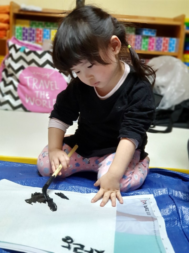 어린이 집에서 붓글씨 배우는 우리 사랑이